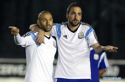 Javier Mascherano (L) and Gonzalo Higuain of Argentina's national soccer team take part in a training session in Rio de Janeiro, Brazil, on July 12, 2014. Germany will face Argentina in the final match of the 2014 FIFA World Cup Brazil, on July 13. (Xinhua/TELAM)