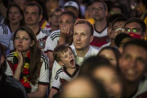 A young fan of the German team feels sleepy as he watches the World Cup final from Beijing. Photo: Li Hao/ GT