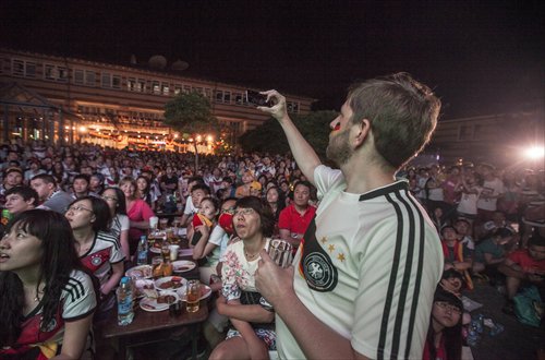 Football fans cheer for Germany at a screening of the World Cup final at the German embassy in Beijing early Monday morning, Beijing time. Photo: Li Hao/ GT