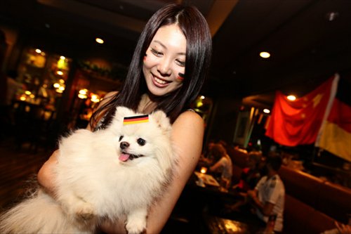 A fan of the German team brings her dog to watch the World Cup final. Photo: Cui Meng/GT