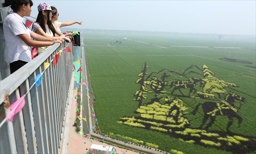 Visitors on Monday view an image in a rice field at the Tanbo Art Park in Shenyang, Liaoning Province. Originally from Japan, Tanbo art involves planting rice of various colors that create giant pictures when viewed from above. The Tanbo Art Park, which is the largest in its kind, officially opens on July 18. Photo: IC