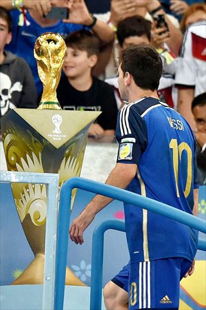 Argentina forward and captain Lionel Messi passes by the FIFA World Cup trophy to be awarded the Golden Ball award after the World Cup final match between Germany and Argentina at Maracana Stadium in Rio de Janeiro on Sunday (Brazilian time). Photo: IC