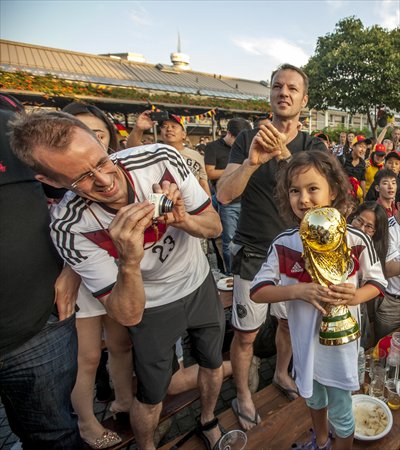 A little fan holds a replica of the World Cup trophy at the German Embassy in Beijing on Monday after Germany won the World Cup in Rio. Photo: Li Hao/GT