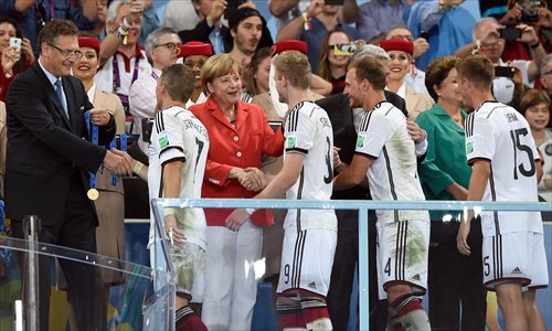 German Chancellor Angela Merkel congratulates Germany players after the World Cup final at the Maracana in Rio de Janeiro on Sunday (Brazilian time). Photo: IC