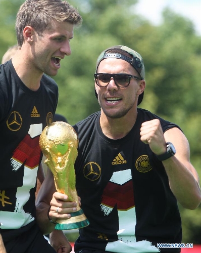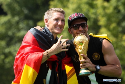 German football players Lukas Podolski (R) and Bastian Schweinsteiger pose during celebration to mark the team's 2014 Brazil World Cup victory in Berlin, Germany, July 15, 2014. Germany's team returned home on Tuesday after winning the 2014 Brazil World Cup. (Xinhua/Zhang Fan)