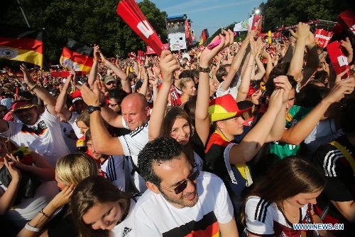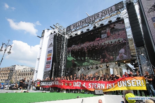 German football fans celebrate to mark their 2014 Brazil World Cup victory in Berlin, Germany, July 15, 2014. Germany's team returned home on Tuesday after winning the 2014 Brazil World Cup. (Xinhua/Zhang Fan)