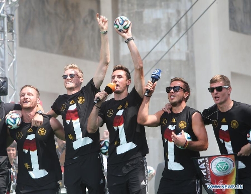 German football players Andre Schuerrle (L2), Miroslav Klose (C), Mario Goetze (R2) and Toni Kroos (R) wave to supporters during celebration to mark the team's 2014 Brazil World Cup victory in Berlin, Germany, July 15, 2014. Germany's team returned home on Tuesday after winning the 2014 Brazil World Cup. (Xinhua/Zhang Fan)