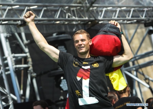 German football player Manuel Neuer waves his fist during celebration to mark the team's 2014 Brazil World Cup victory in Berlin, Germany, July 15, 2014. Germany's team returned home on Tuesday after winning the 2014 Brazil World Cup. (Xinhua/Zhang Fan)