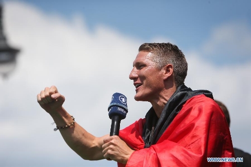 German football player Bastian Schweinsteiger gestures during celebration to mark the team's 2014 Brazil World Cup victory in Berlin, Germany, July 15, 2014. Germany's team returned home on Tuesday after winning the 2014 Brazil World Cup. (Xinhua/Zhang Fan)