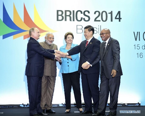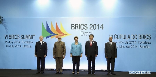 Chinese President Xi Jinping (2nd R) poses for a group photo with Russian President Vladimir Putin (1st L), Indian Prime Minister Narendra Modi (2nd L), Brazilian President Dilma Rousseff (C), and South African President Jacob Zuma during the sixth BRICS summit in Fortaleza, Brazil, July 15, 2014. (Xinhua/Wang Ye)