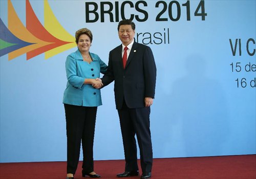 Chinese President Xi Jinping (R) shakes hands with Brazilian President Dilma Rousseff during the sixth BRICS summit in Fortaleza, Brazil, July 15, 2014. Photo: Xinhua