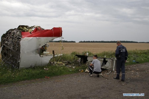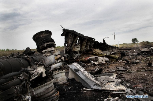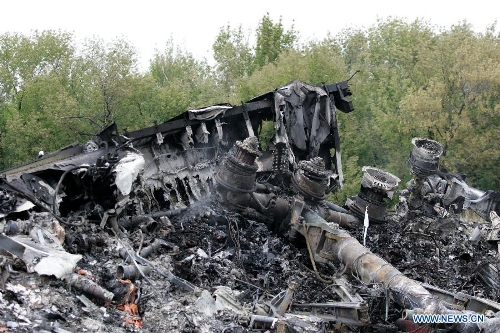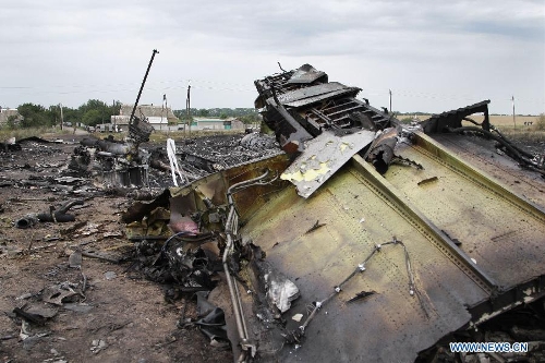 Photo taken on July 18, 2014 shows the debris of MH17 of Malaysian Airlines near the city of Shakhtarsk in Ukraine's Donetsk region. Malaysian Transport Minister Liow Tiong Lai said Friday that according to the International Civil Aviation Organization's Annex 13, the Ukrainian government should institute an investigation into the circumstances of the deadly MH17 incident, and be responsible for the conduct of the investigation. (Xinhua/Alexander Ermochenko)