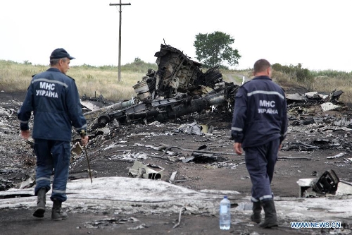 Rescuers work at the crash site of MH17 of Malaysian Airlines near the city of Shakhtarsk in Ukraine's Donetsk region, July 18, 2014. Malaysian Transport Minister Liow Tiong Lai said Friday that according to the International Civil Aviation Organization's Annex 13, the Ukrainian government should institute an investigation into the circumstances of the deadly MH17 incident, and be responsible for the conduct of the investigation. (Xinhua/Alexander Ermochenko)