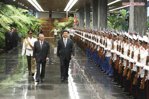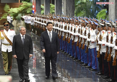 Chinese President Xi Jinping (C) attends a welcoming ceremony held by Cuban President Raul Castro (1st L Front) in Havana, capital of Cuba, July 22, 2014. (Xinhua/Lan Hongguang)