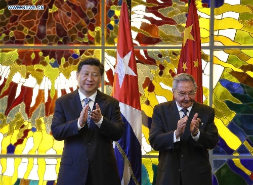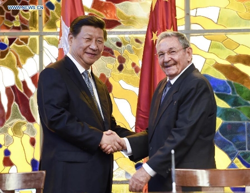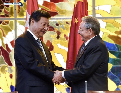 Chinese President Xi Jinping (L) and Cuban President Raul Castro attend a signing ceremony for bilateral documents in Havana, capital of Cuba, July 22, 2014. (Xinhua/Lan Hongguang)