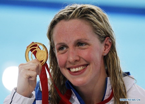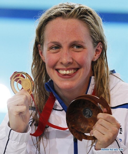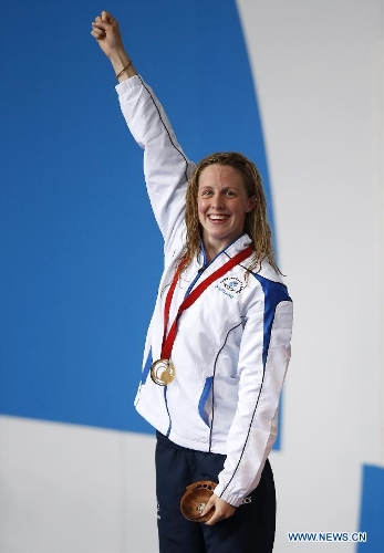 Hannah Miley of Scotland celebrates during the medal ceremony for Women's 400m Individual Medley Final during day 1 of the Glasgow 2014 Commonwealth Games at Tollcross International Swimming Centre in Glasgow, Scotland on July 24, 2014. Hannah Miley claimed the title with a Commonwealth Games record time of 4:31.76. (Xinhua/Wang Lili)