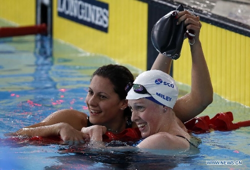 Hannah Miley of Scotland celebrates with England's Aimee Wilmott after Women's 400m Individual Medley Final during day 1 of the Glasgow 2014 Commonwealth Games at Tollcross International Swimming Centre in Glasgow, Scotland on July 24, 2014. Hannah Miley claimed the title with a Commonwealth Games record time of 4:31.76. Aimee Wilmott took the silver with 4:33.01. (Xinhua/Wang Lili)