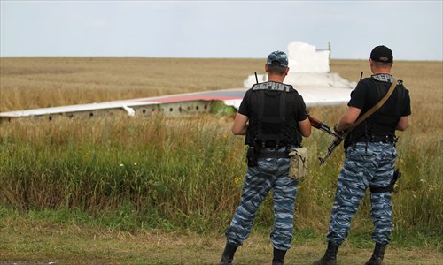 Two military officers look at a piece of debris from the crashed flight MH17 on Friday in Donetsk, Ukraine. Photo: Cui Meng/GT