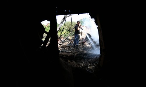 A Firefighter extinguishes the flames on the remains of a house in Donetsk, Ukraine on Monday. Several homes were destroyed in the strike. Photo: Cui Meng/GT