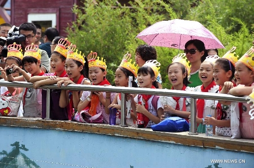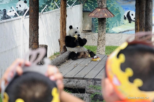 Children sing birthday songs for giant pandas at Taiyuan Zoo in Taiyuan, capital of north China's Shanxi Province, Aug. 2, 2014. Saturday is the fourth birthday of the giant pandas Caitao and Huchun here. Caitao and Huchun migrated to Taiyuan from Ya'an Giant Panda Protection and Research Center last May. (Xinhua/Fan Minda)