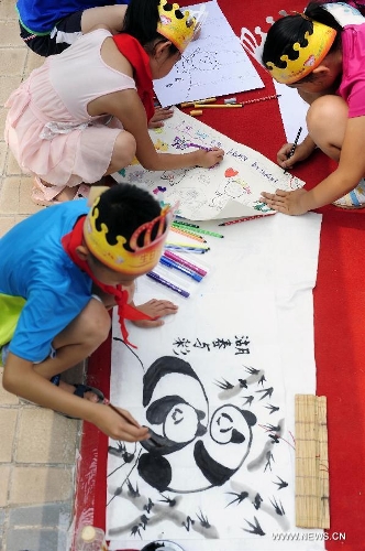 Children draw pictures of giant pandas at Taiyuan Zoo in Taiyuan, capital of north China's Shanxi Province, Aug. 2, 2014. Saturday is the fourth birthday of the giant pandas Caitao and Huchun here. Caitao and Huchun migrated to Taiyuan from Ya'an Giant Panda Protection and Research Center last May. (Xinhua/Fan Minda)
