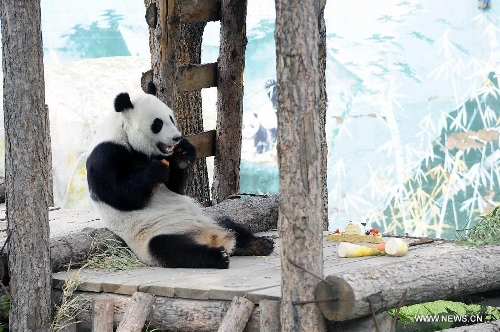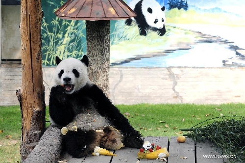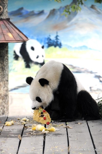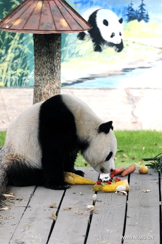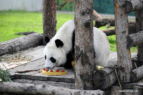 Giant panda Huchun enjoys her birthday meal at Taiyuan Zoo in Taiyuan, capital of north China's Shanxi Province, Aug. 2, 2014. Saturday is the fourth birthday of the giant pandas Caitao and Huchun here. Caitao and Huchun migrated to Taiyuan from Ya'an Giant Panda Protection and Research Center last May. (Xinhua/Fan Minda)