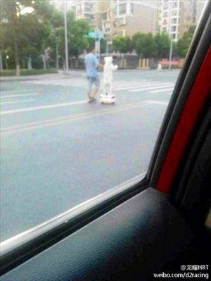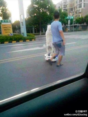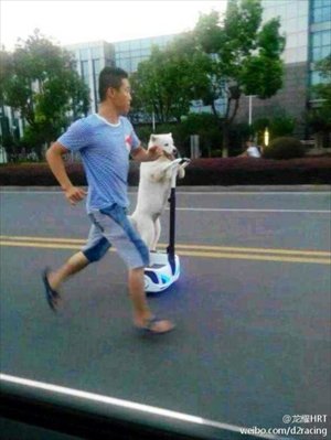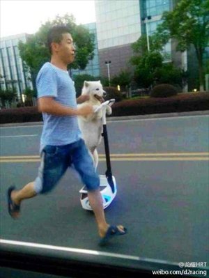 A dog rides on a Segway-like device in Shenzhen, Guangdong Province alongside its running owner in a photo posted by Net user "LongyaoHRT" on Sina Weibo August 5. Photo: weibo.com