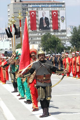 The Turkish army's historical music band Mehter performs on Saturday in Ankara, during ceremonies marking the 92nd anniversary of the Victory Day, commemorating the Turkish victory against Greek forces at the Battle of Dumlupinar, the final battle of the War of Independence. Photo: AFP