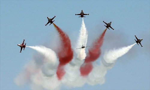 The aerobatic demonstration team of the Turkish air force, the Turkish Stars, perform with their supersonic jets on Saturday in Ankara, during ceremonies marking the 92nd anniversary of the Victory Day. Photo: AFP