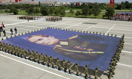 Soldiers carry a large poster of the founder of modern Turkey, Mustafa Kemal Ataturk, during a ceremony on Victory Day in Ankara, Turkey, on Saturday. Turkey's new President Recep Tayyip Erdogan, as commander-in-chief, presided over a ceremony marking a 92-year-old victory over Greece which was considered crucial in the Turkish War of Independence and the founding of the modern Turkish republic. Photo: IC