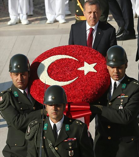 President Erdogan (back) attends on Saturday ceremonies marking the 92nd anniversary of the Victory Day. Victory Day symbolizes the power of the Turkish nation in overcoming obstacles with the spirit of brotherhood, he said. Photo: AFP
