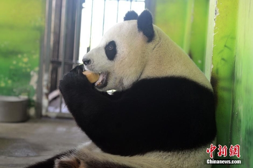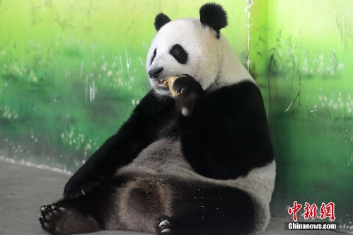Giant pandas "Xinyue" and "Zhuyun" are enjoying the specially mademoon cakes at the Taihu Lake National Wetland Park in Suzhou, east China's Jiangsu Province, Sept. 7, 2014. (Source: ecns.cn)
