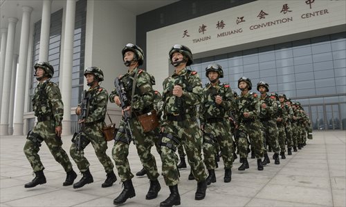Security guards conduct a drill in front of the Tianjin Meijiang Convention Center, venue of the Summer Davos Forum. Photo: CFP