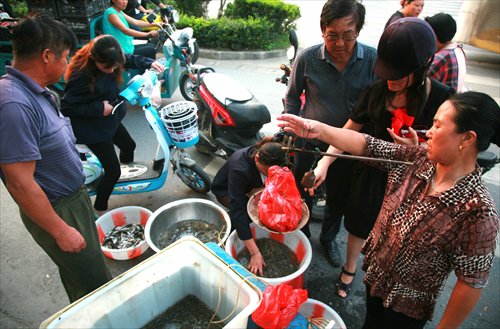 Tai Juying puts their catch on sale at a local market. Photo: IC