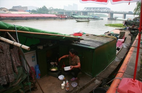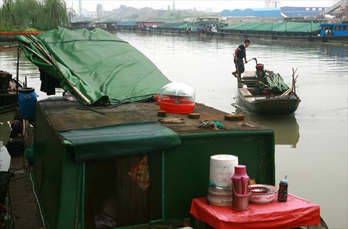 Yang Shaogui returns to their houseboat on the canal. Photo: IC