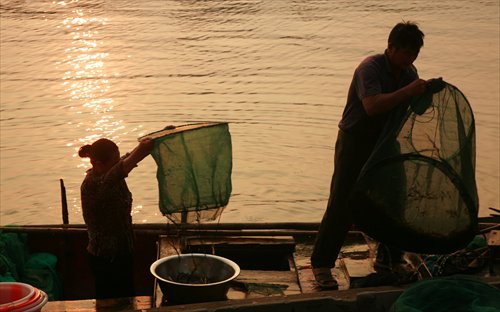Fisherman Yang Shaogui and his wife return from a day's work as the sun sets. Photo: IC