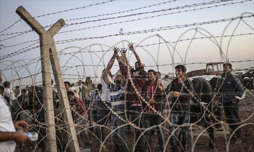 Syrian Kurds try to grab water thrown over the border from Turkey at the southeastern town of Suruc in Sanliurfa Province on Sunday. Tens of thousands of Syrian Kurds flooded into Turkey on September 20, fleeing an onslaught by the jihadist Islamic State group that prompted an appeal for international intervention. Photo: AFP