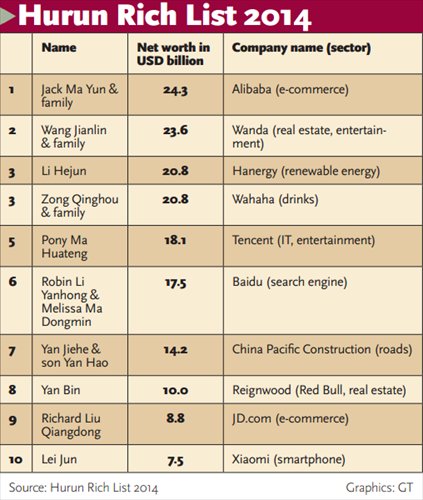 China's super-rich are also seeking political status to go with their wealth. A total of 174 entrepreneurs on the list have political appointments, 14 more than last year. Among the Top 50, 40 percent have senior political appointments, higher than any other country and a "very Chinese characteristic," Hoogewerf told the Global Times.