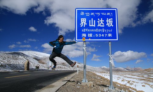 Yang Shuo, an intrepid traveler, strikes a pose at a road sign for Jieshan Daban area on the China National Highway 219 in the far west of Tibet. The section lays claim to being the highest road in the world. Photo: Courtesy of Yang Shuo