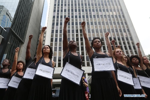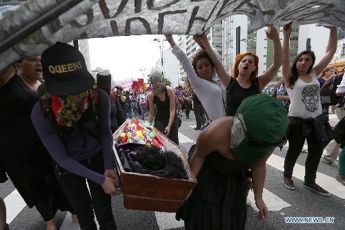 Residents attend a protest called "Funeral procession for the death of a woman during a clandestine abortion", in Sao Paulo, Brazil, on Sept, 28, 2014. A demonstration demanding the legalization of abortion in the country was held during the commemoration of "Day for the Decriminalization of Abortion in Latin America and Caribbean", according to local press. (Xinhua/Rahel Patrasso)