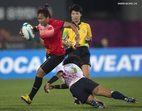 Chen Keyi (1st L) of China competes during the women's rugby final match against Japan at the 17th Asian Games in Incheon, South Korea, Oct. 2, 2014. China defeated Japan 14-12 and claimed the title. (Xinhua/Fei Maohua)