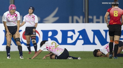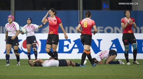 Players of Japan get depressed after the women's rugby final match against China at the 17th Asian Games in Incheon, South Korea, Oct. 2, 2014. China defeated Japan 14-12 and claimed the title. (Xinhua/Fei Maohua)