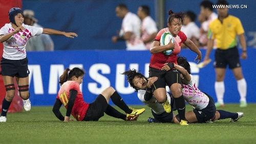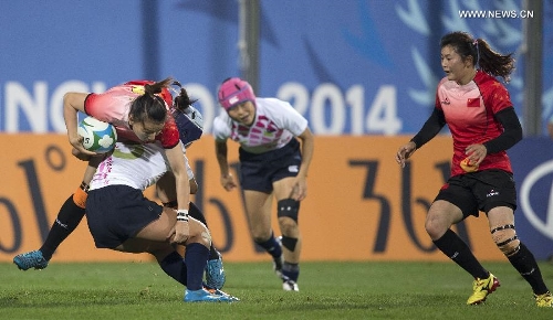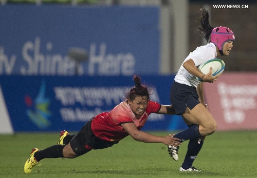 Yu Xiaoming (R, upper) of China breaks through during the women's rugby final match against Japan at the 17th Asian Games in Incheon, South Korea, Oct. 2, 2014. China defeated Japan 14-12 and claimed the title. (Xinhua/Fei Maohua)
