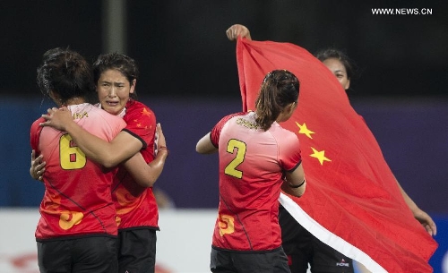 Players of China shed tears after the women's rugby final match against Japan at the 17th Asian Games in Incheon, South Korea, Oct. 2, 2014. China defeated Japan 14-12 and claimed the title. (Xinhua/Fei Maohua)