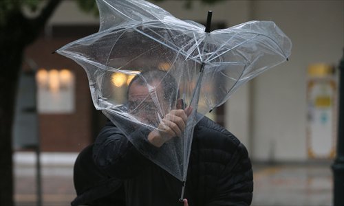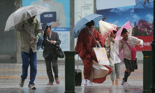 A man grips his umbrella as Typhoon Vongfong, which means "sting" in Cantonese, hit Himeji in Japan Monday. According to the Japan Meteorological Agency's typhoon intensity scale, Vongfong is the third "violent typhoon" of 2014, following Genevieve and Halong, with winds of up to 180 kilometers per hour. Photo: CFP
