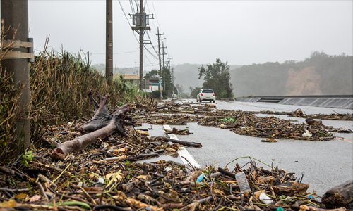 Typhoon Vongfong cause high waves that breached seawalls carrying ocean debris into the streets Sunday in Okinawa, Japan. Photo: CFP