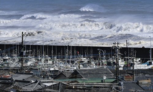 High waves surge toward the port in Kawaminami, Miyazaki Prefecture on Japan's southern island of Kyushu Monday. At least one person is missing and dozens were injured as Typhoon Vongfong churned northward. Photo: AFP