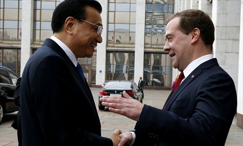 Russian Prime Minister Dmitry Medvedev welcomes Chinese Premier Li Keqiang before a meeting in Moscow on Monday. Photo: AFP