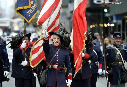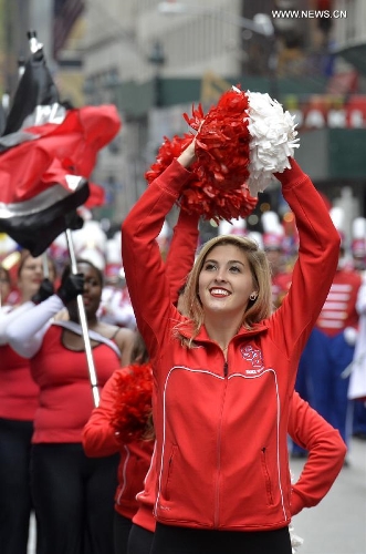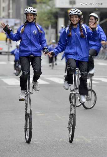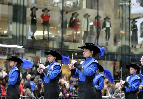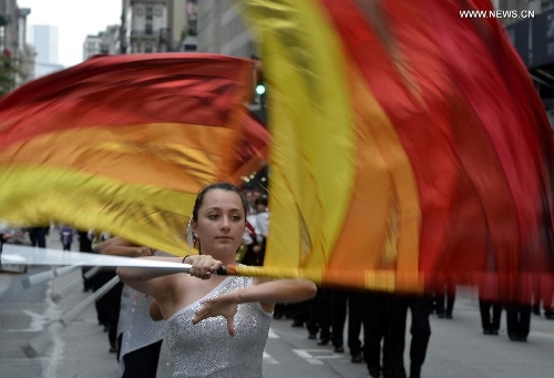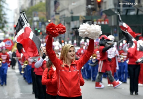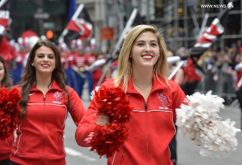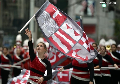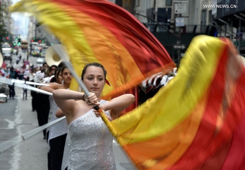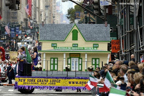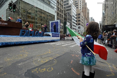 People attend the 70th Columbus Day parade on Manhattan's Fifth Avenue in New York, the United States, on Oct. 13, 2014. Thousands of people participated in the celebration of the Italian American culture and heritage here on Monday. (Xinhua/Wang Lei)