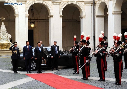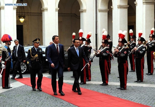 Chinese Premier Li Keqiang attends a welcoming ceremony held by Italian Prime Minister Matteo Renzi in Rome, Italy, Oct. 14, 2014. (Xinhua/Rao Aimin)